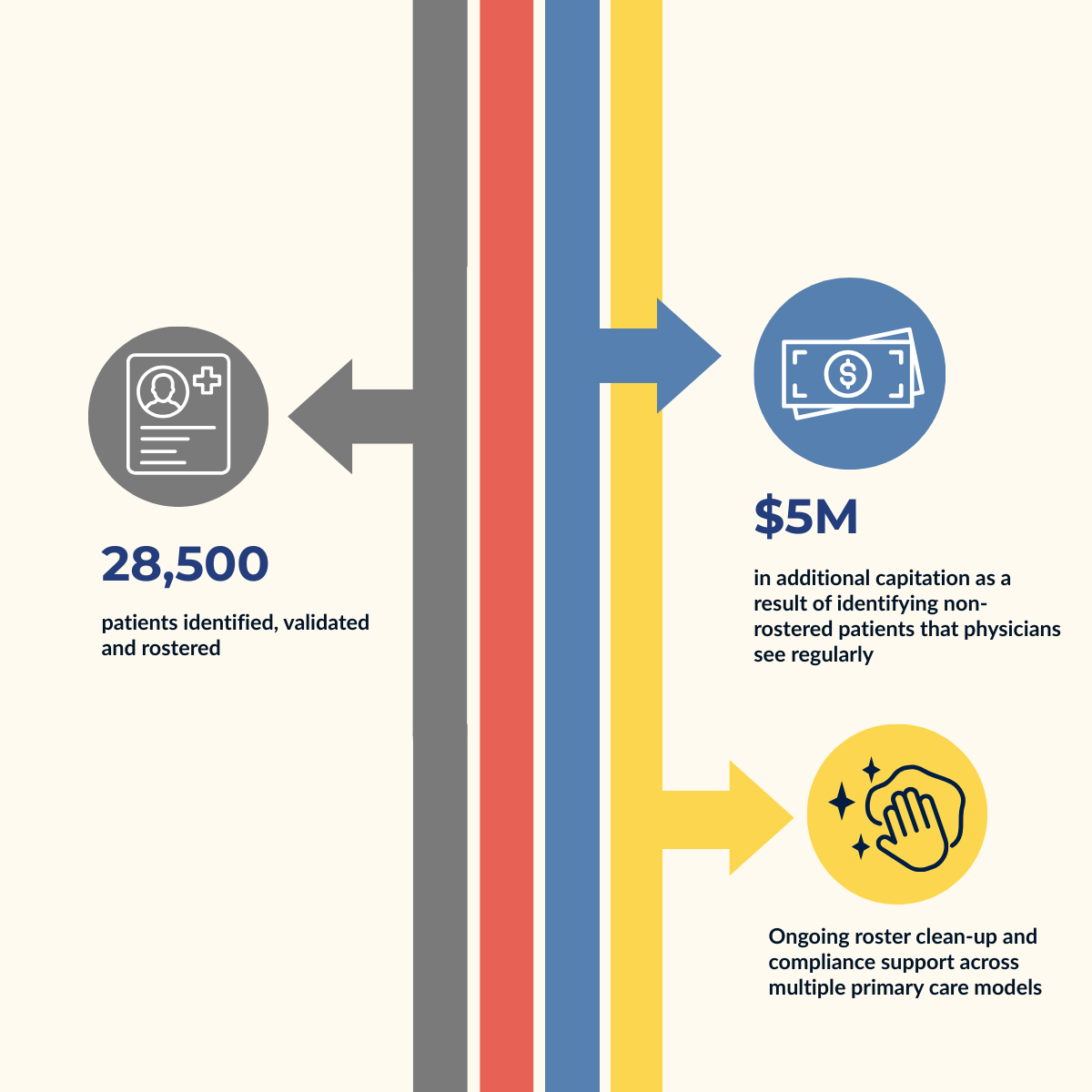 Accurate rosters are essential for practice stability, especially as payment models continue to evolve. In 2025, we supported clinics in strengthening patient attachment and improving roster integrity through our Patient Care service, resulting in rostering over 28,000 patients and recovering over $5 million in additional capitation.